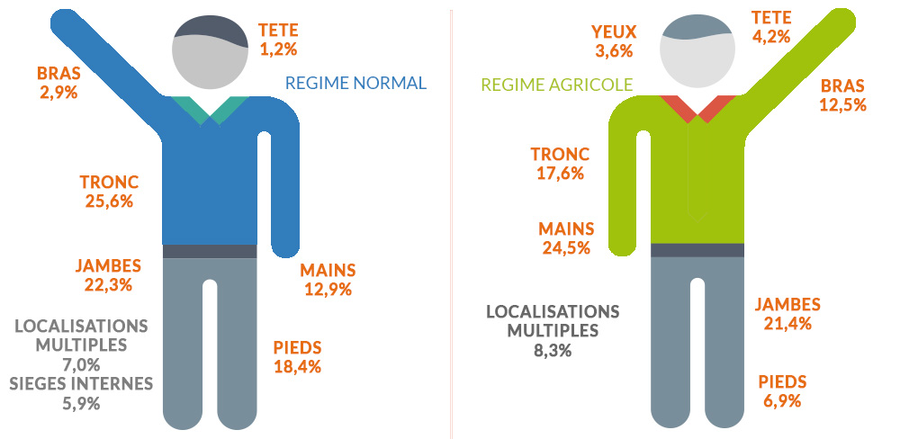 Le quart des blessures imputables aux accidents du travail est localisé au tronc. C’est dans la construction que l’on constate le plus grand nombre de blessures à ce niveau, l’activité de commerce et de réparation automobile étant le deuxième secteur le plus concerné. Dans 22 % des AT, elles se situent au niveau des jambes et dans 18 % au niveau des pieds. Quel que soit le sexe, les jambes, le tronc ainsi que les pieds restent les zones les plus touchées.